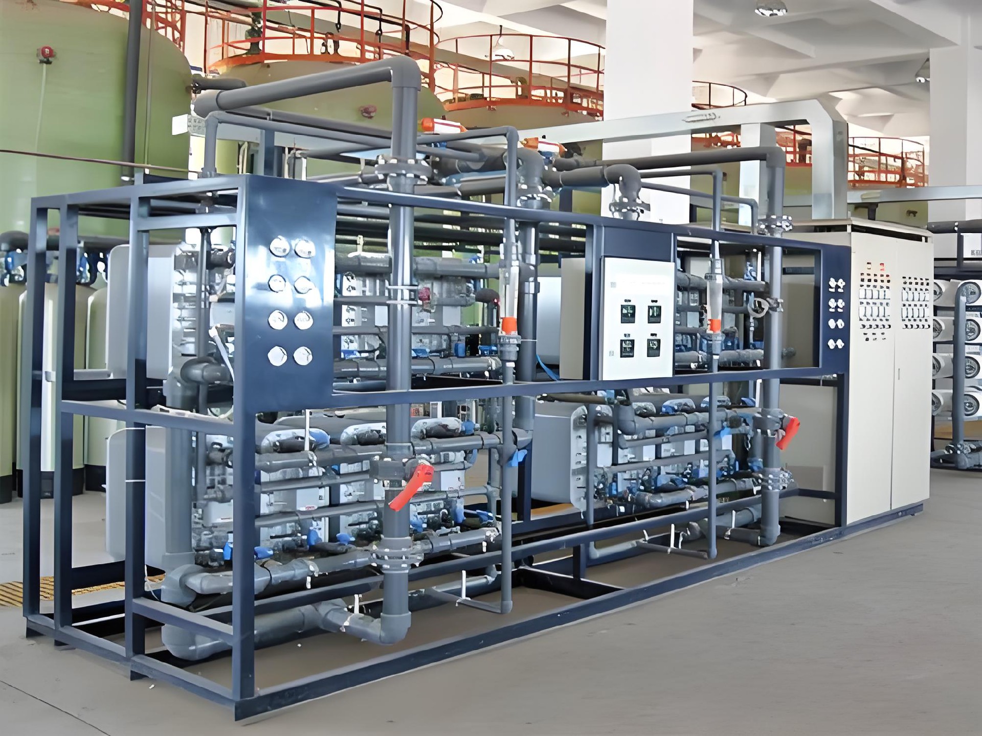 双级反渗透系统:预处理后的水进入双级反渗透系统,通过保安过滤器、高压泵和反渗透膜,滤除95%以上的电解质和大分子化合物,包括胶体微粒和病毒等。这一步骤大大延长了后续离子交换柱的使用寿命。