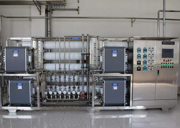 电子厂安装EDI超纯水现场,通过原水进入EDI系统,电去离子净水技术,将离子交换技术、离子交换膜技术和离子电迁移技术相结合的纯水制造技术。它巧妙的将电渗析和离子交换技术相结合,利用两端电极高压使水中带电离子移动,并配合离子交换树脂及选择性树脂膜以加速离子移动去除,从而达到水纯化的目的。