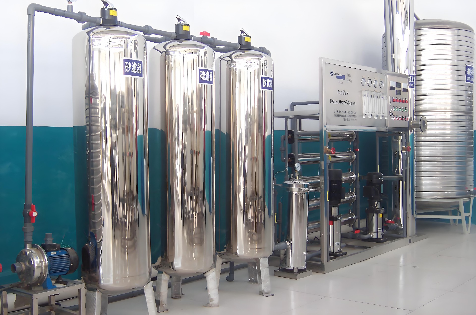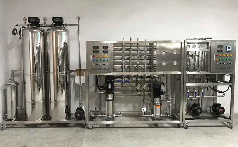 不锈钢水箱+原水加压泵-→自动多介质过滤器+ 自动活性炭过滤器→(自动软水器) - +过滤器→一级反渗透一→PH调节→纯水箱+第二级反渗透- +无菌水箱+纯水泵+臭氧杀菌系统一, 紫外线杀菌器+ 微孔过滤器+用水点