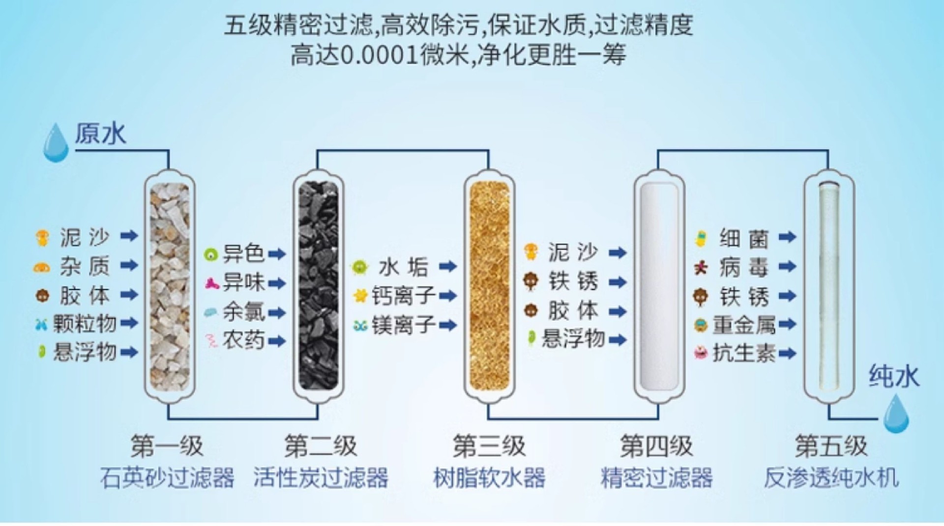 2: 预处理-一级反渗透-二级反渗透(正电荷反渗膜)-纯化水箱-纯水泵-紫外灯-用水点